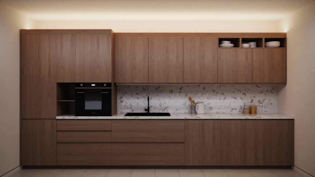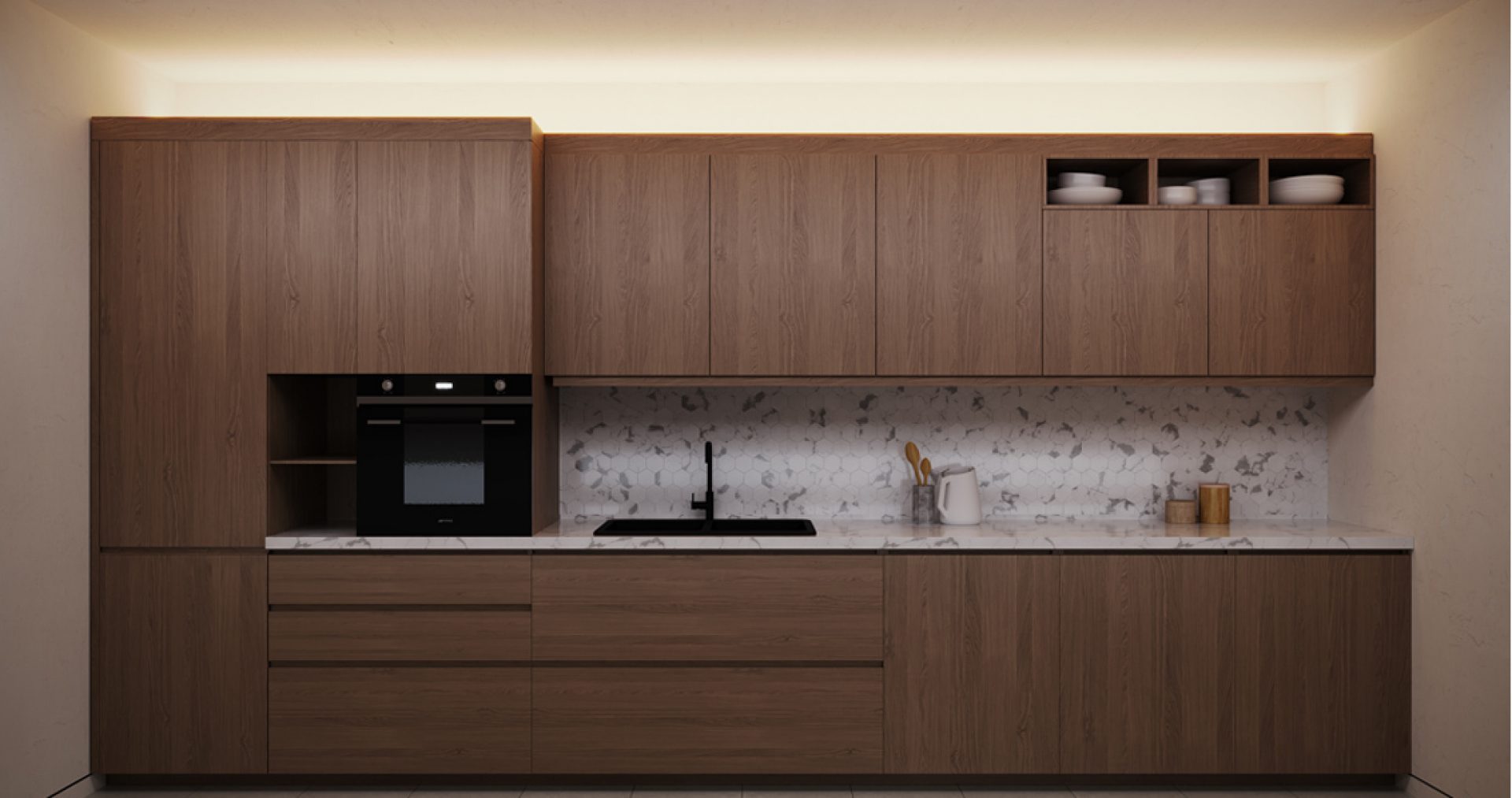 Balance useful ambient light in the room with a decorative effect on the wall behind the cabinets.