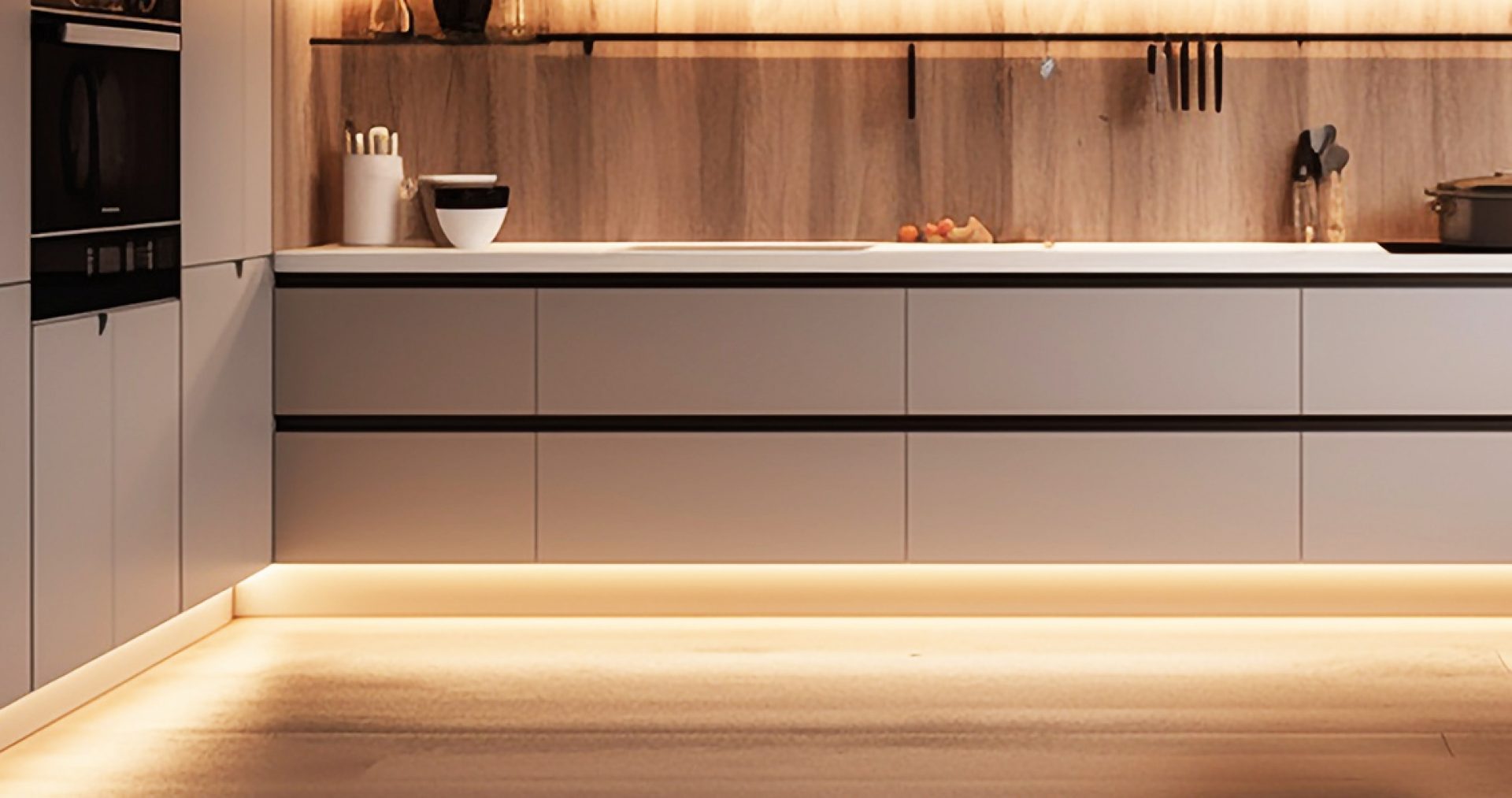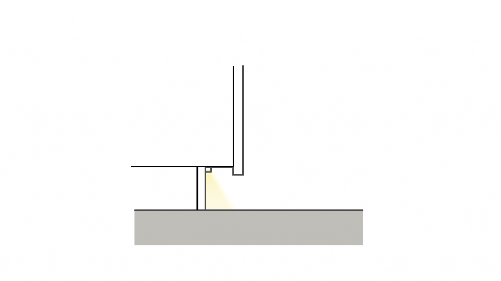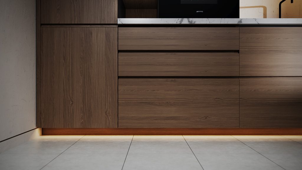 Emphasize light projection from the toe-kick onto the floor beyond the cabinet.