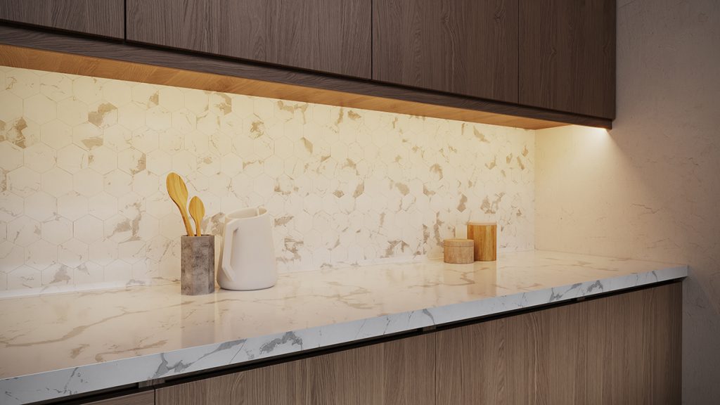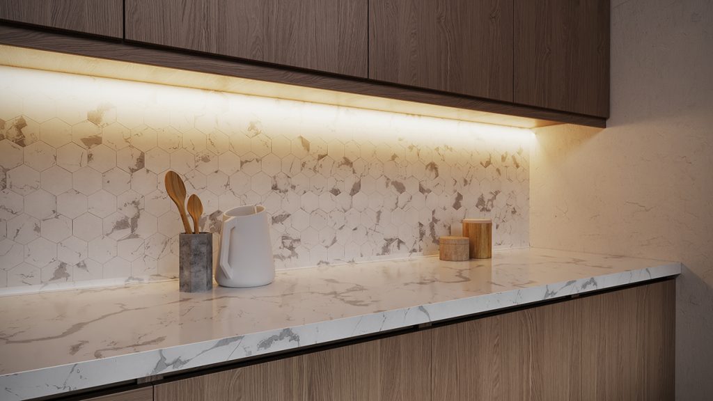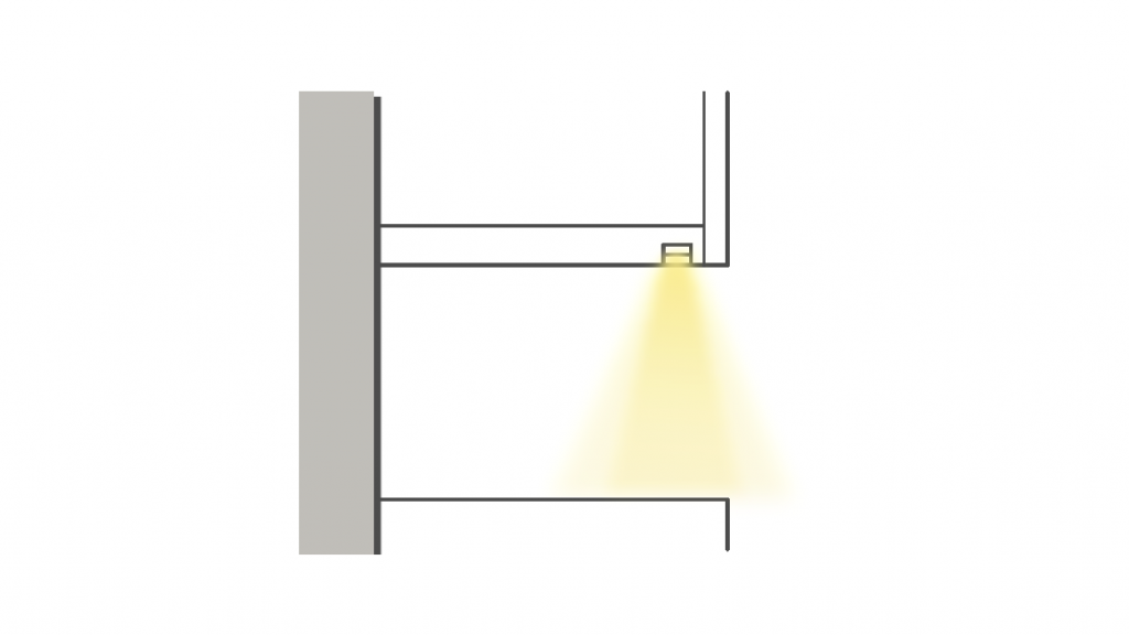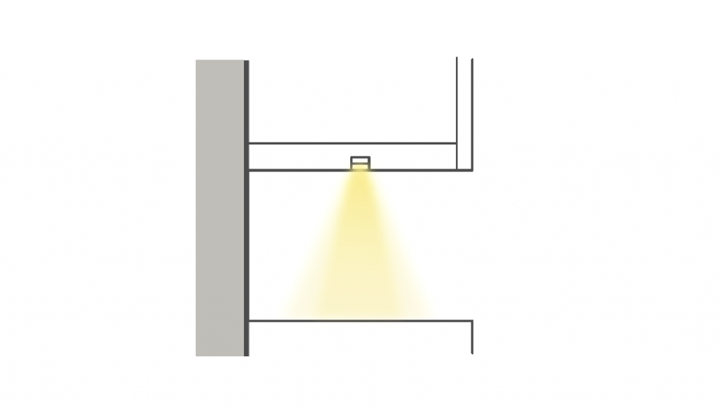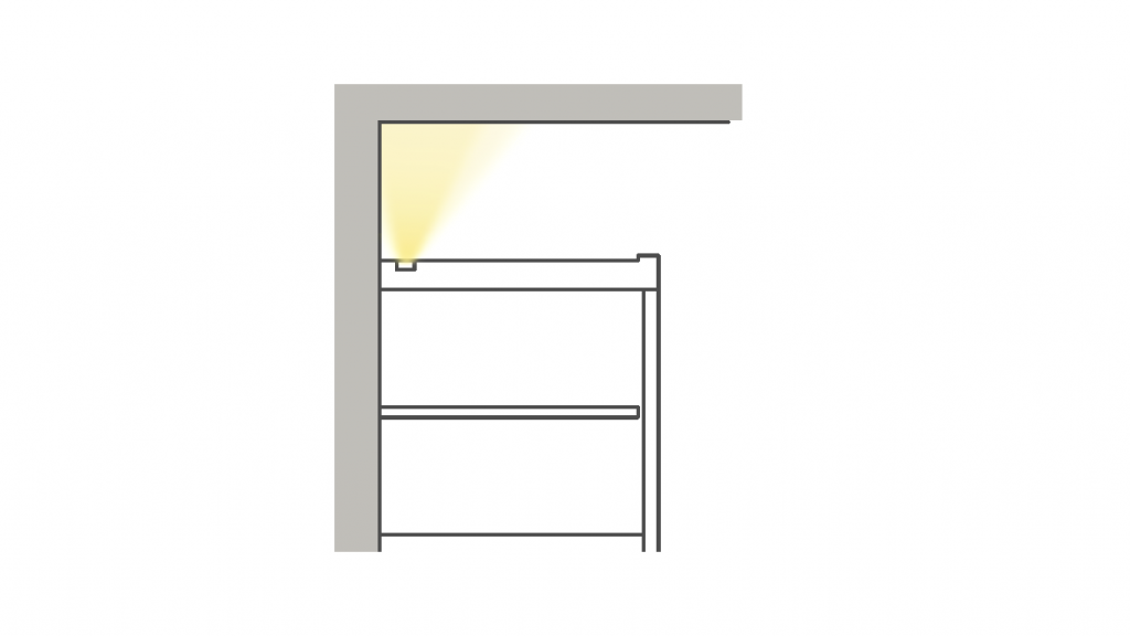 Positioning the light towards the center of the cabinet delivers light to the work surface and to the backsplash. It’s a balanced option that is ideal for average depth countertops. The channel can be embedded into cabinet millwork or surface mounted.