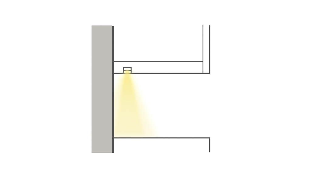 Positioning the light at the wall emphasizes the backsplash. This is primarily a decorative effect, yet still delivers light to the work surfaces. The channel should be embedded into the cabinet itself, or even recessed further to create a small pocket between the backsplash and the cabinet.