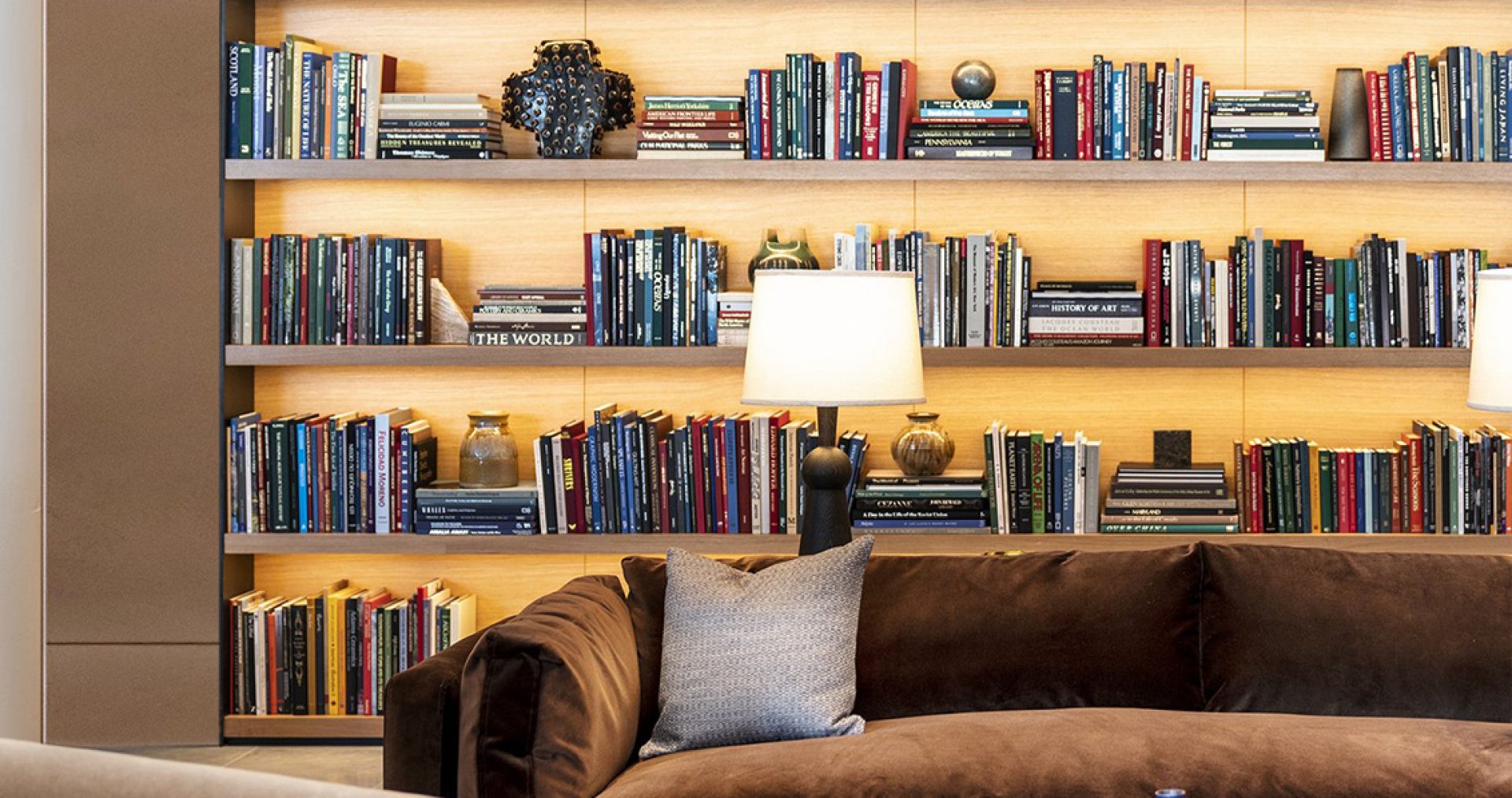 Mount the light at the front of the upper shelf, aiming down. Either recess the light into the shelf, and/or build a small valence to conceal the light further and prevent glare. Take care to leave grooves or slots for wire management for the wires leading into and/or out of the fixtures.