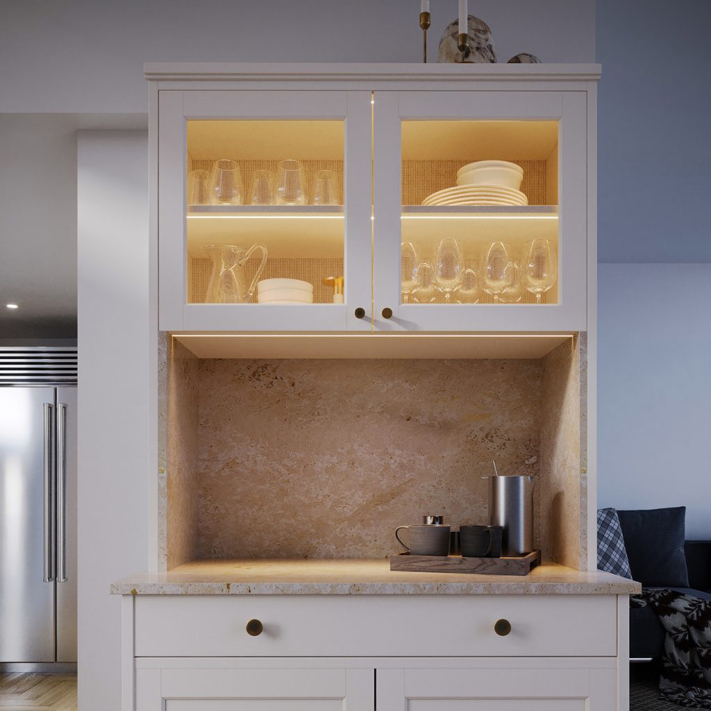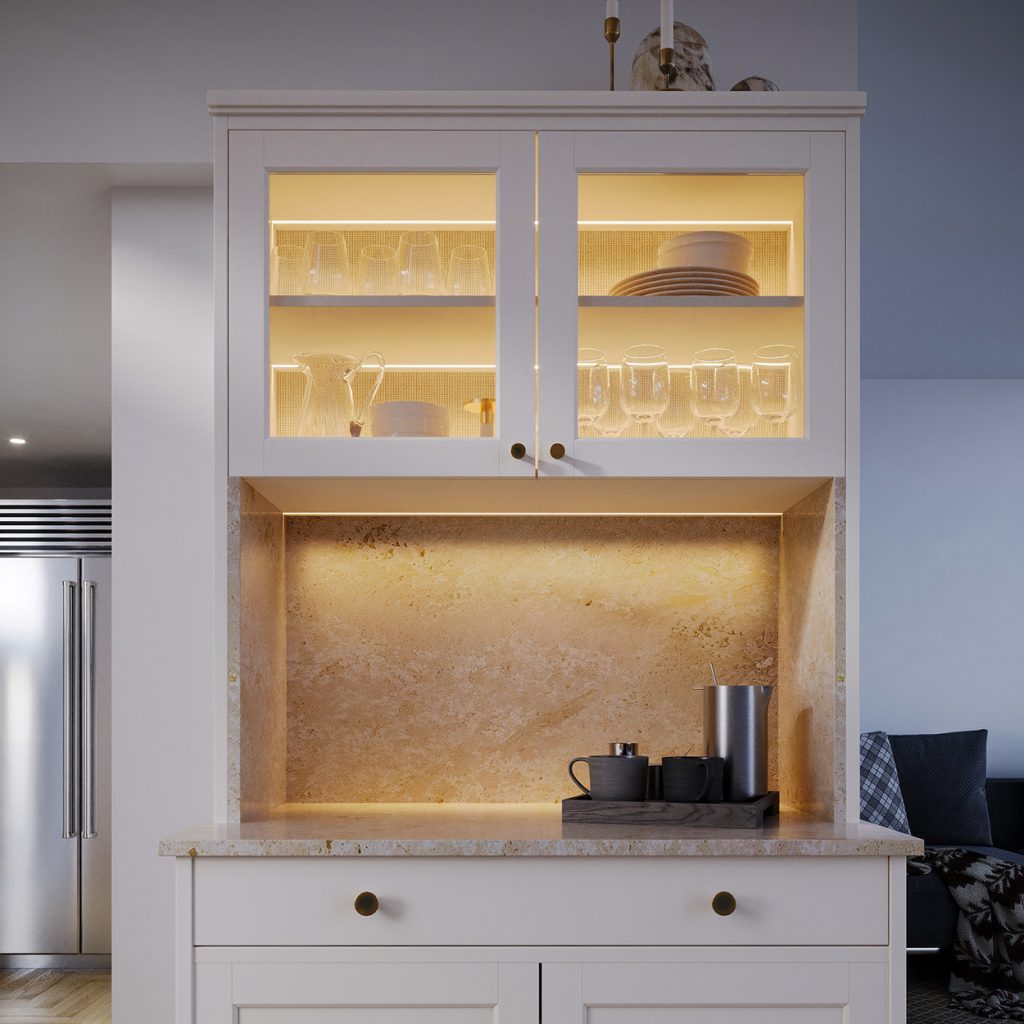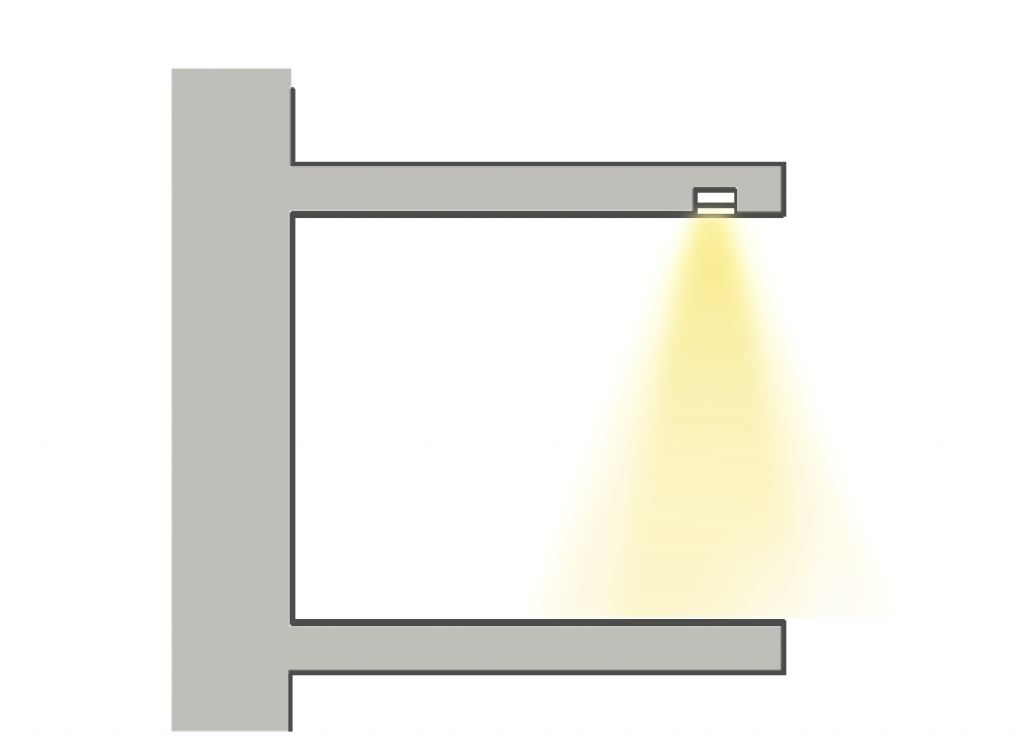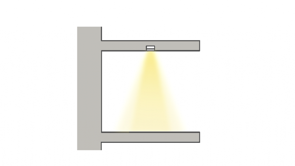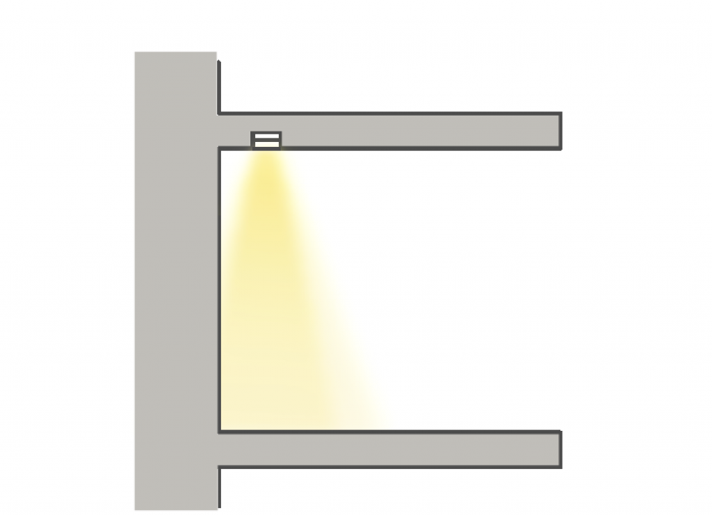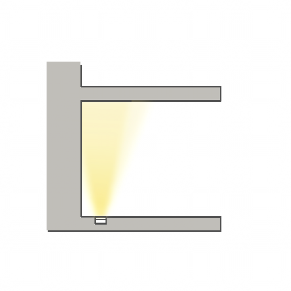 Positioning the light at the wall emphasizes the backsplash. This is primarily a decorative effect, yet still delivers light to the work surfaces. The channel should be embedded into the upper shelf, or even recessed further to create a small pocket between the backsplash and the cabinet.