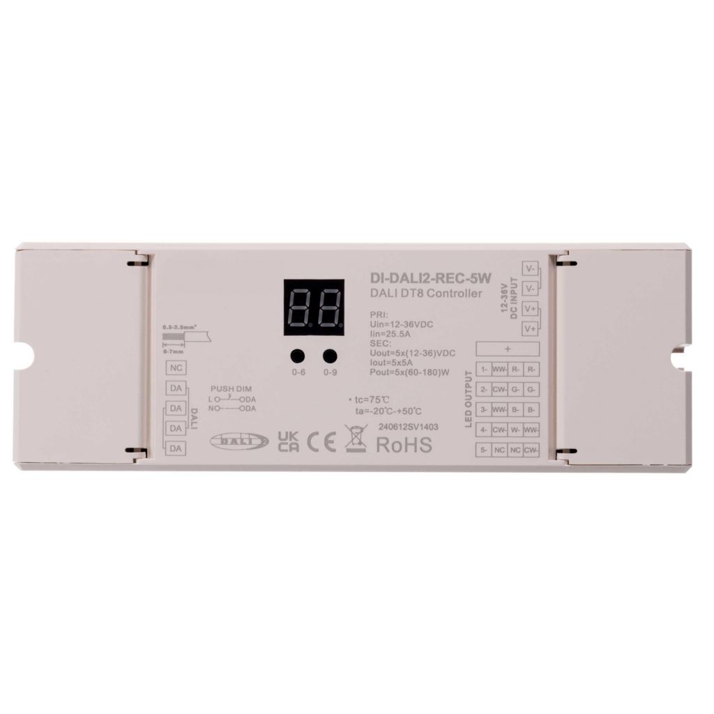 The 5-Channel Decoder offers precise control of TW, RGB, RGBW, and RGBWW lighting systems within a DALI2 control system, ensuring advanced lighting management. Its compact design and reliable performance make it ideal for complex, multi-zone lighting projects.