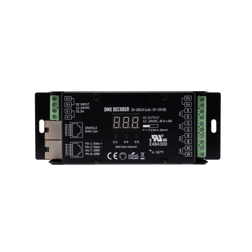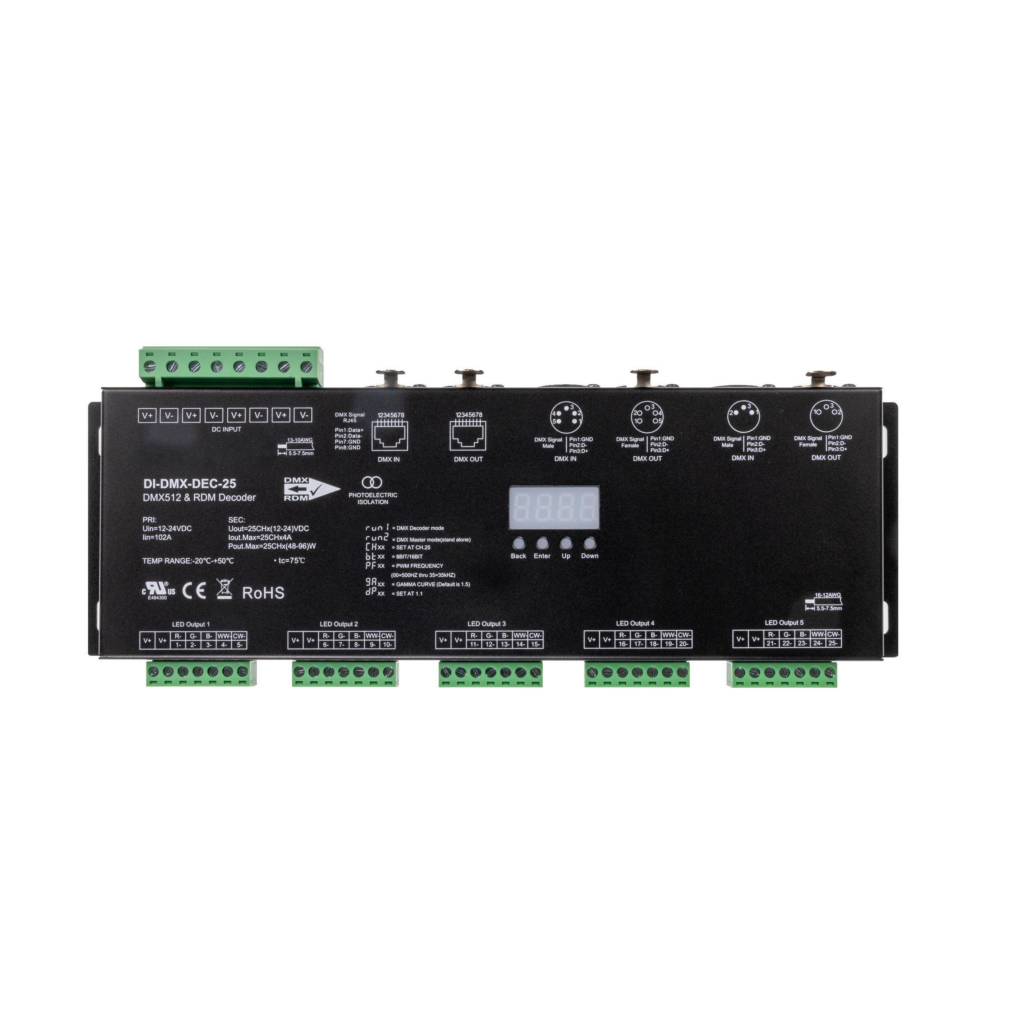 Control low-voltage LED lighting with flicker-free performance and compatible with 4-6 wire light engines; it can be used as a standalone/master controller or companion decoder. The 5-channel decoder, featuring a digital display for fast and easy connections, has a drive capacity of up to 480W per receiver at 24V.