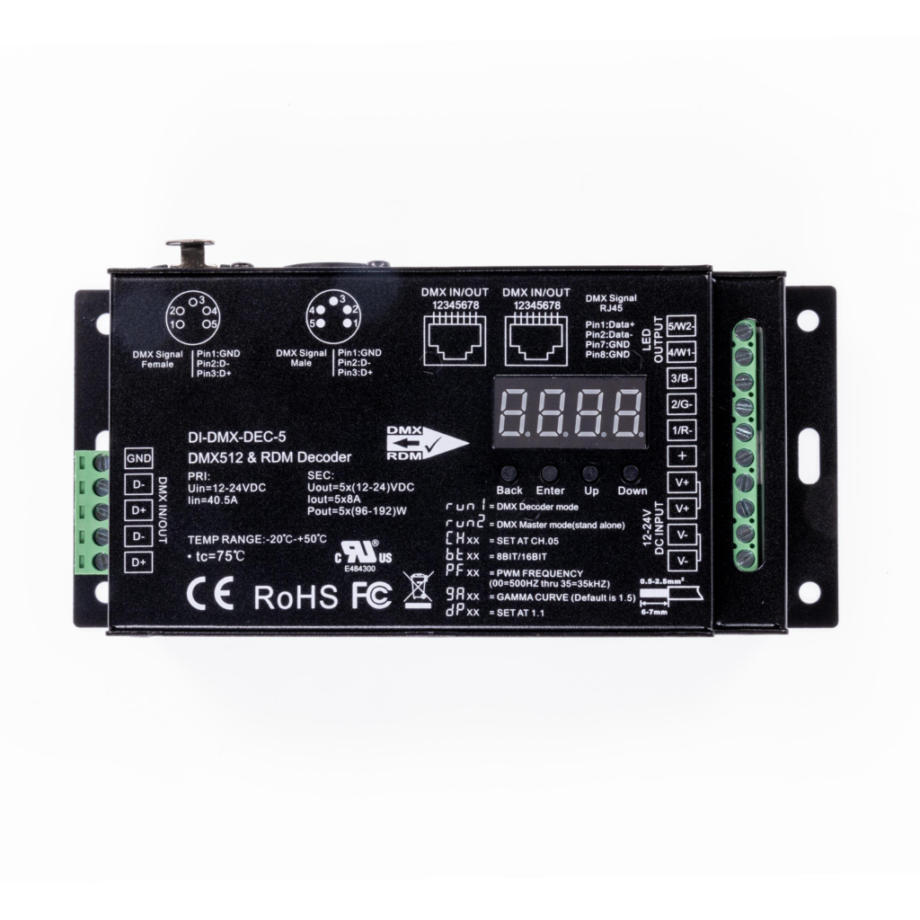 Control low-voltage LED lighting with flicker-free performance and compatible with 4-6 wire light engines; it can be used as a standalone/master controller or companion decoder. The 5-channel decoder featuring a digital display for fast and easy connections, has drive capacity up to 480W/960W per receiver at 12V/24V respectively.
