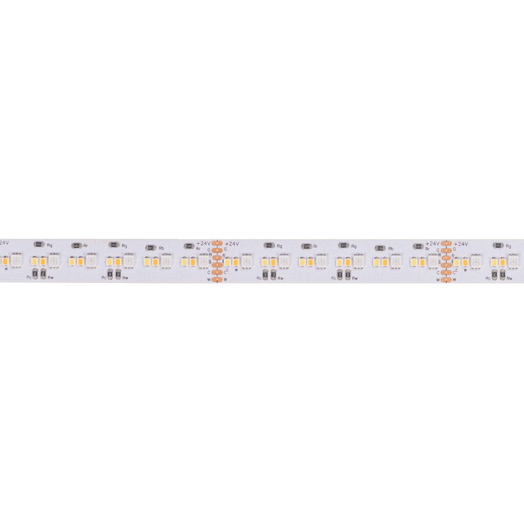 Combining RGB capabilities with tunable white light ranging between 2400K and 6500K, this high-density tape light enables billions of color combinations and superior color blending for a variety of environments.