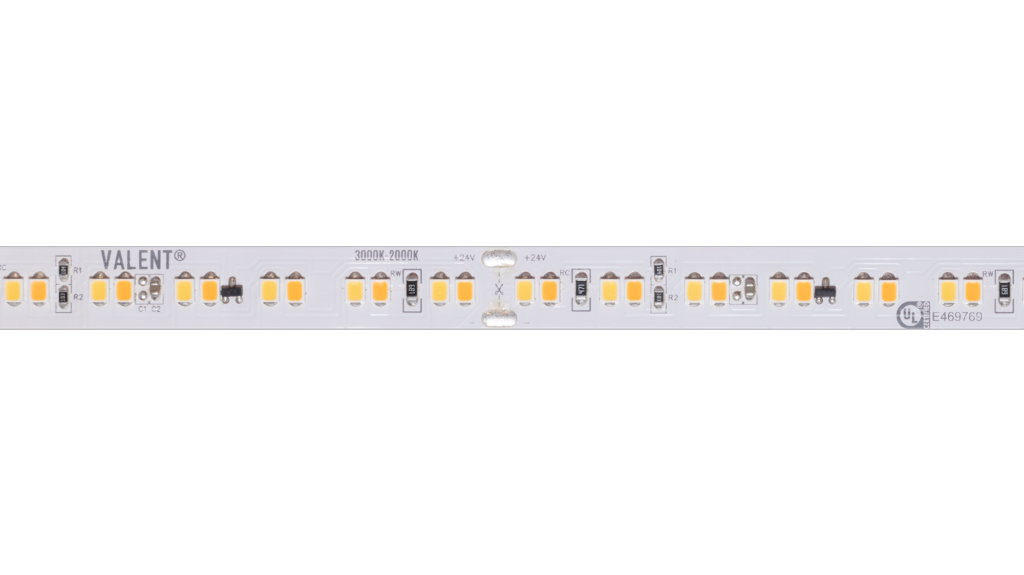 Diffused tape light that is designed to produce a warming glow as it dims. Offers a dynamic dimming experience ranging from 3000K down to 1800K.