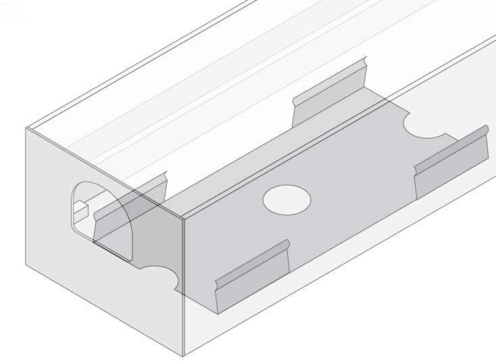A shallow, architectural-grade fixture with an integrated wire raceway.