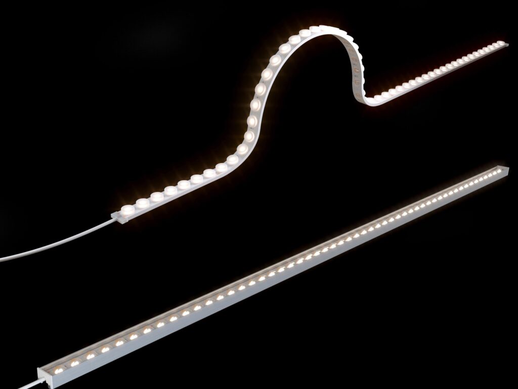 Flexible linear lighting with on-board optics for grazing, wall washing, and accents. Suitable for wet locations (IP65) and outdoors.