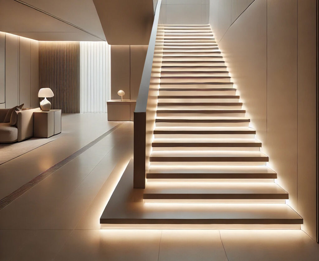 Position the linear light under each step, aiming downward. Use an accent-level light and install a wire chase down one side so each length's lead can be run back to the LED drivers at a central, accessible location.